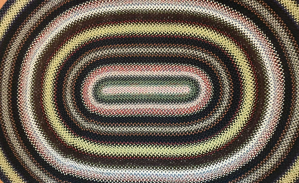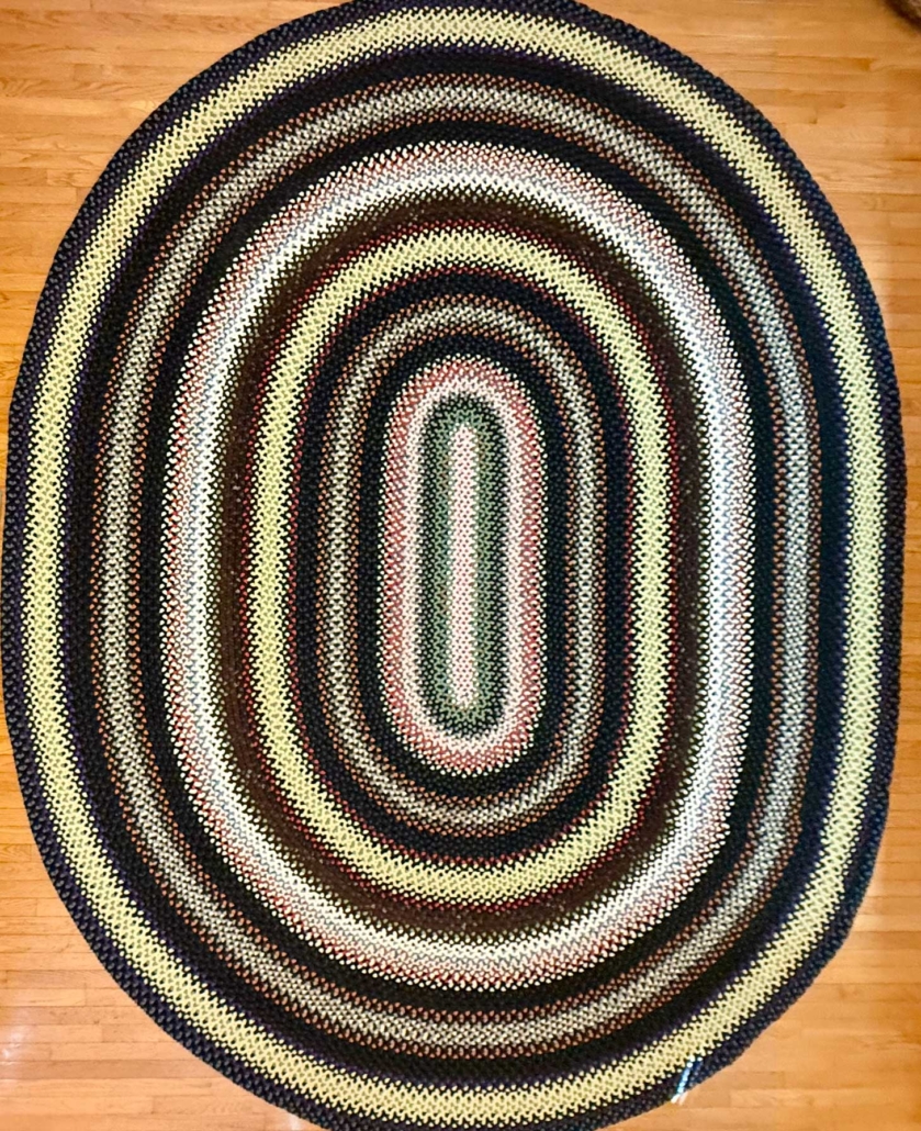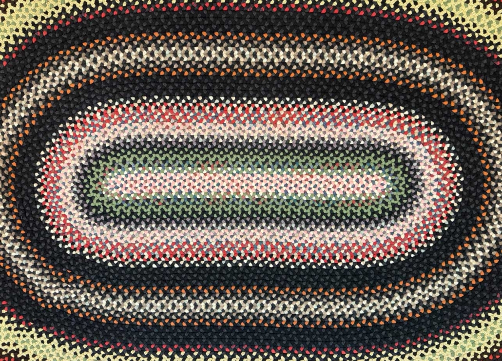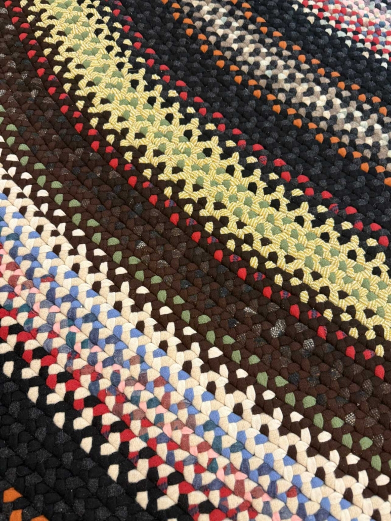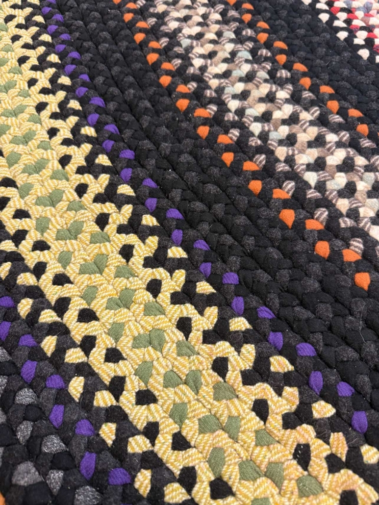 This extraordinary 9’8″ x 12’5″ braided rug is a masterpiece of craftsmanship. Hand-braided in bold tones of black, purple, orange, pink, and green, it was created by a gentleman who has made over 100 rugs in his lifetime. Originally crafted for his daughter, this heirloom-quality piece is in like-new condition and ready to grace a spacious home or lodge with warmth, artistry, and heritage.