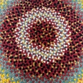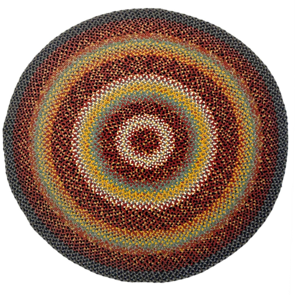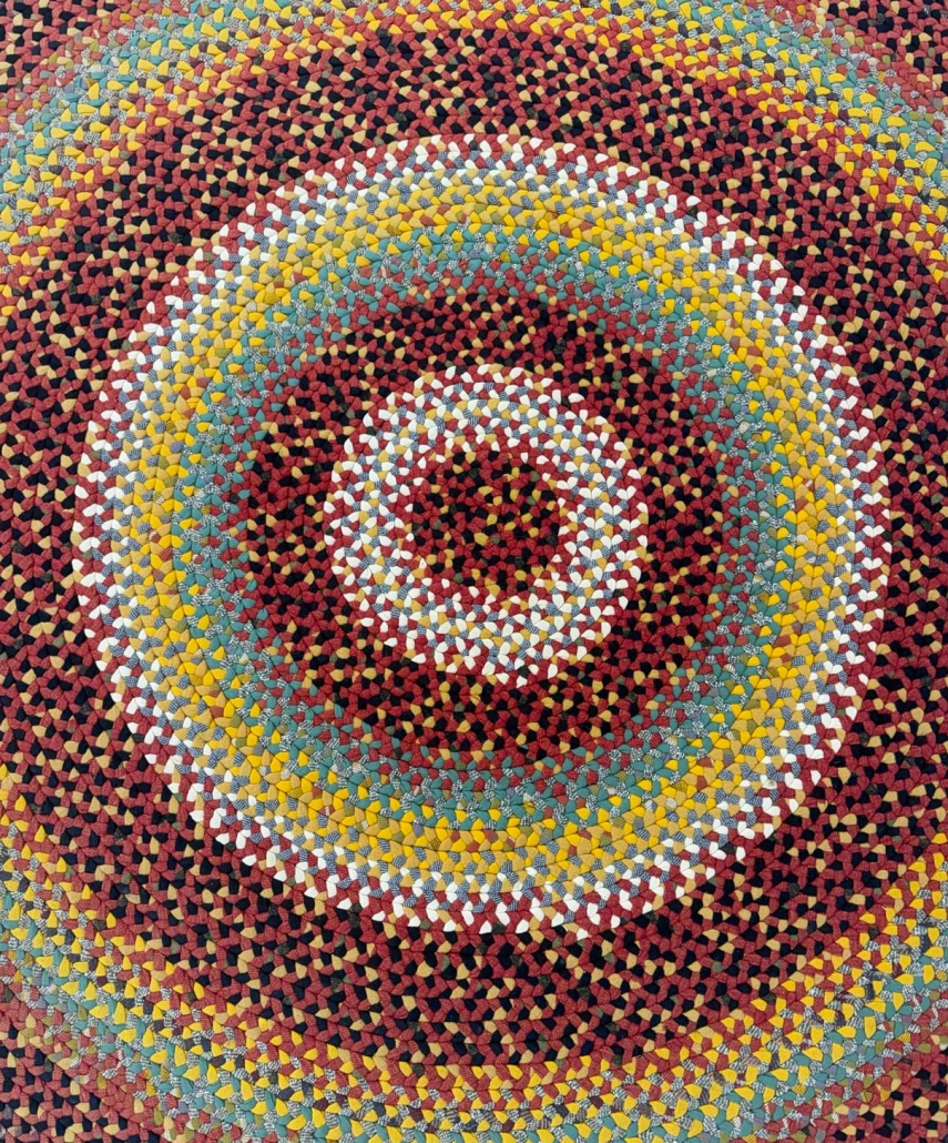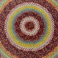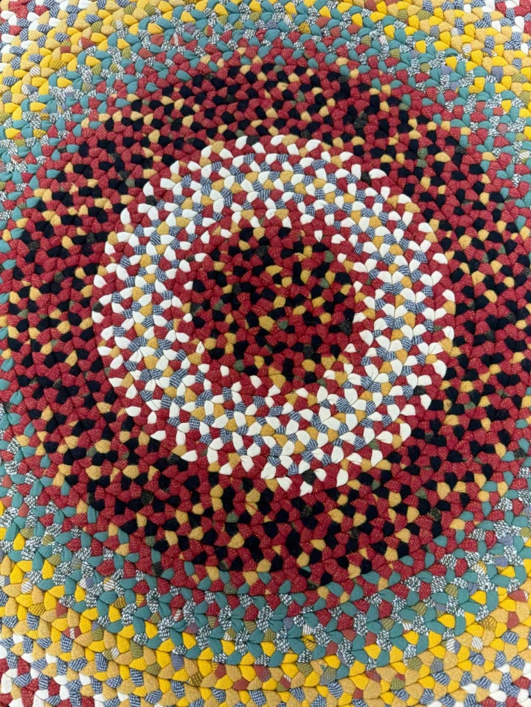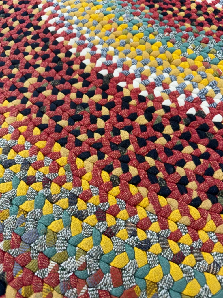 Vibrant handmade round braided rug in golds, teals and black, in great condition and fully reversible.